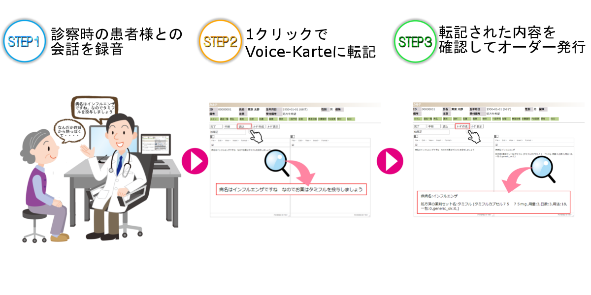 クリニック向け音声解析機能搭載クラウド電子カルテVoice-Karteの最大の特徴は、ドクターと患者様との会話の録音をGoogle等の音声認識と自社開発の構文解析にかけることにより、わずか3ステップ(①診察時の会話の録音、②音声のテキスト化、③テキスト化された記録からのオーダ発行)で操作を完了できることです。