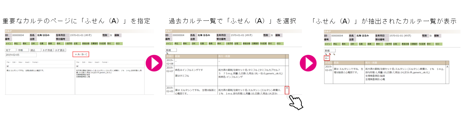 Voice-Karteにヴァーチャルな「ふせん」機能を追加しました。 ふせん機能は、ドクターがカルテの中で重要と感じたページのいくつかに「ふせん(A)」を指定できます。指定した後、[過去カルテ]一覧画面で「ふせん(A)」を選択すると、「ふせん(A)」として抽出されたカルテが一覧表示されます。「ふせん」はA・B・Cの三つのグループを用意し、グループの名前はドクターが随時変更できます。