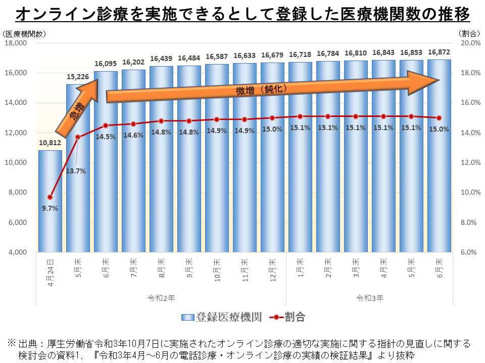 ただし、2020年4月~6月に急増したオンライン診療の導入施設も、その後は微増(鈍化)に転じています。この要因として、PCやスマホを経由するオンライン診療では患者の状態の変化に気づきにくいという課題が指摘されています。例えば照明の当たり方等の影響により、顔色が実際とかけ離れてしまい診断に影響を与えることがあり得ます。